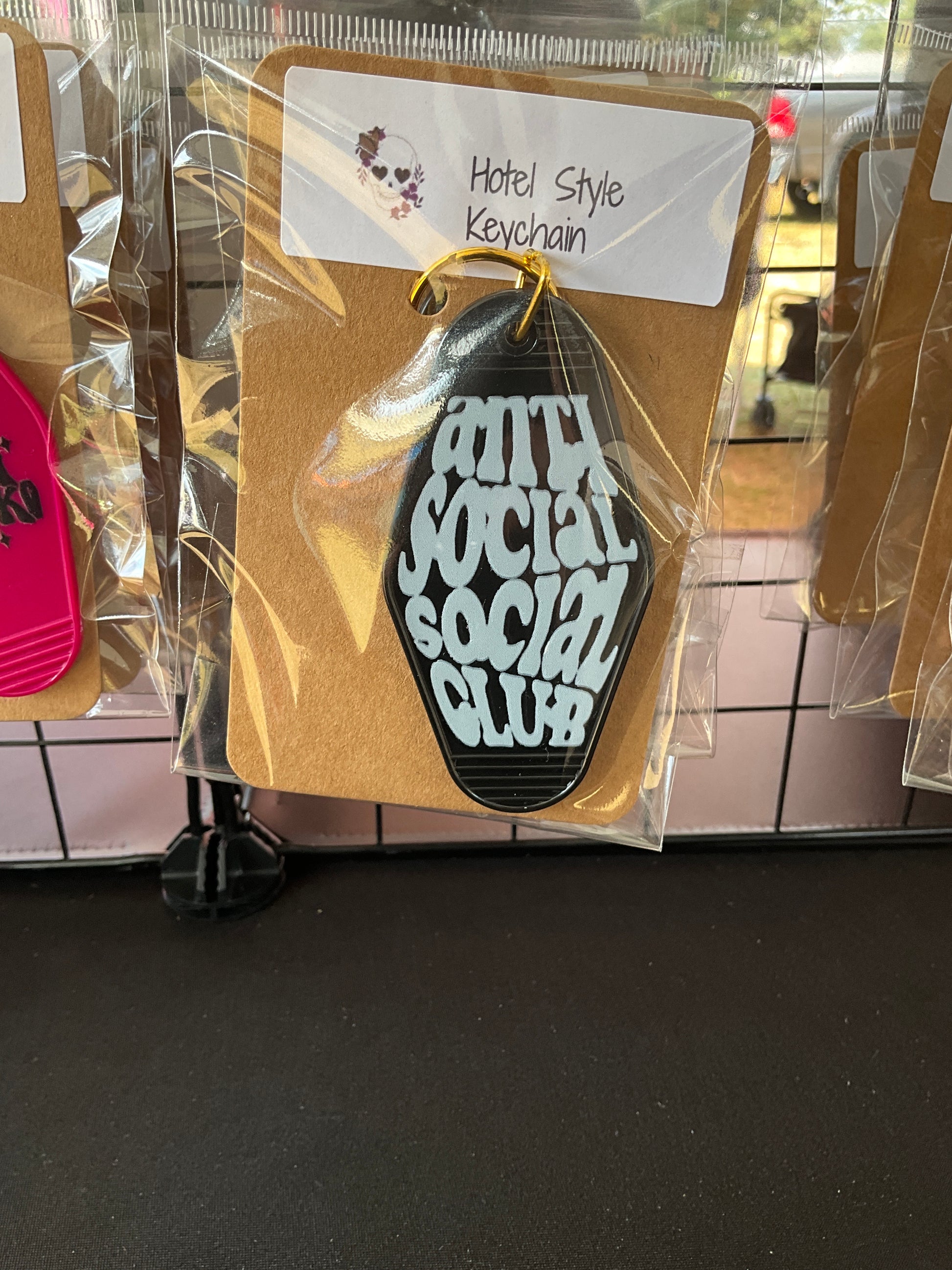 This black hotel style keychain comes with the phrase "Anti Social Social club” on it.