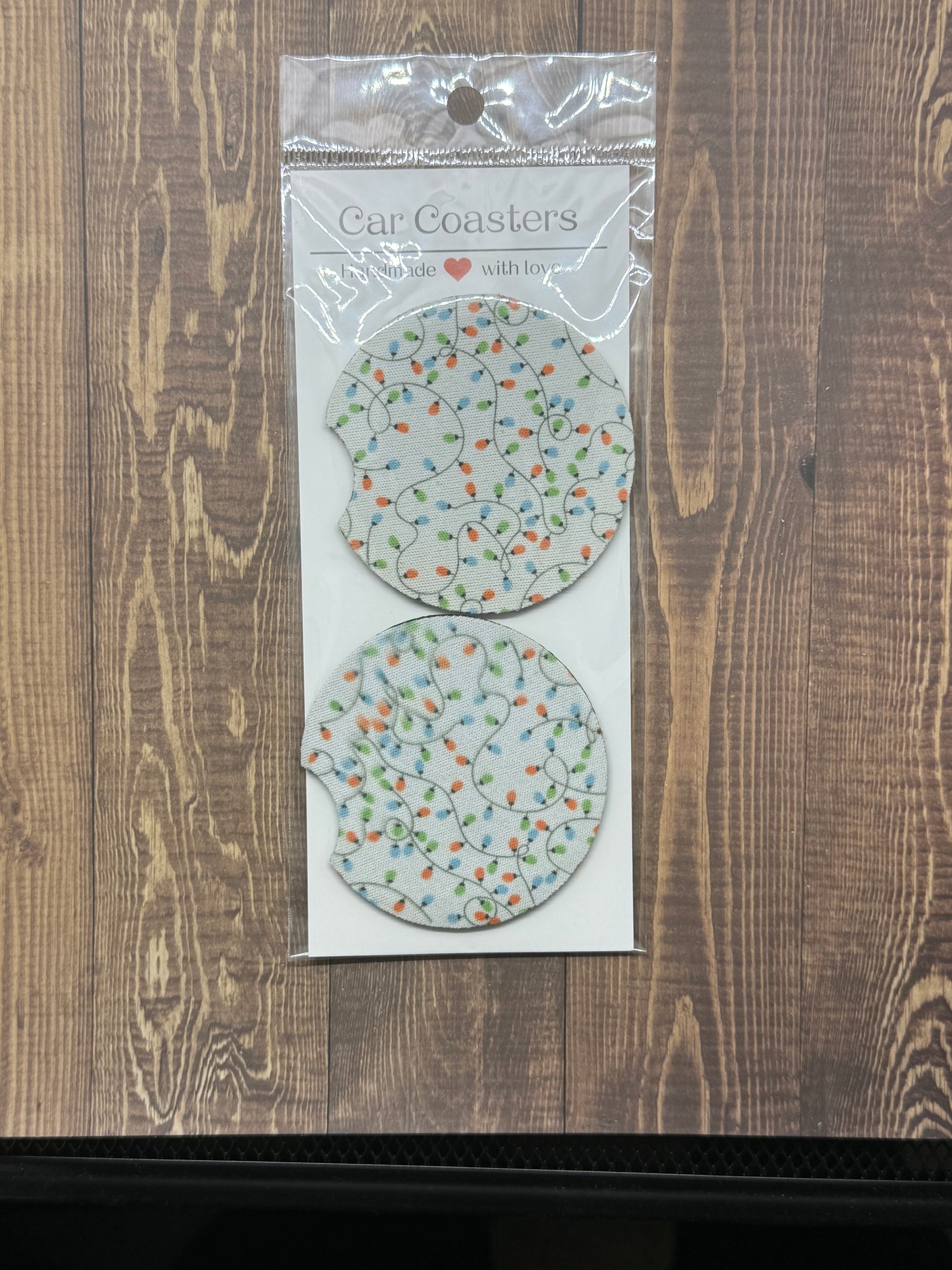 Christmas Lights themed set of neoprene car coasters.