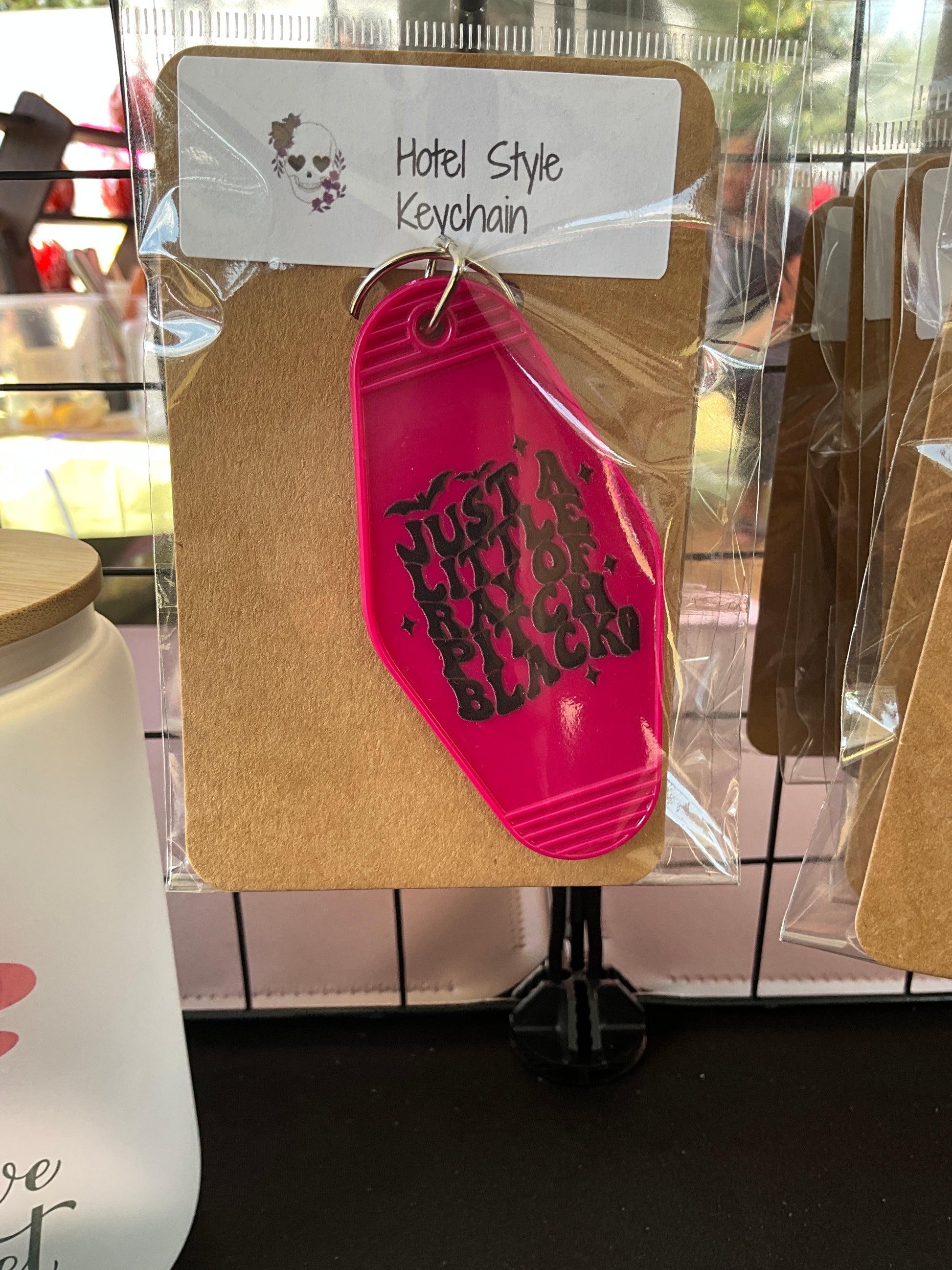 This maroon hotel style keychain comes with the phrase "Little Ray of Pitch Black” on it with bats.